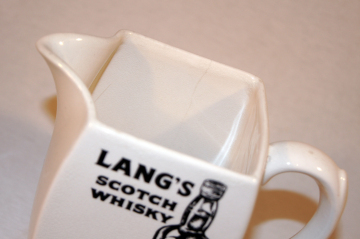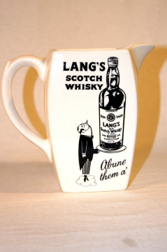 Lang’s Scotch Whisky water jug with a Barman holding atray with a bottle upon it. Abune them a’